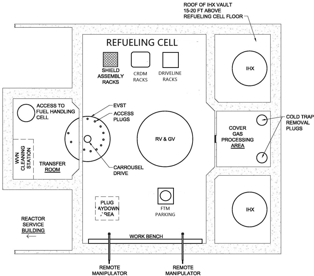 Another refueling facility in the Reactor Service Building is the Fuel Handling Cell (FHC). On CRBRP, this facility did not proceed beyond conceptual design. The purpose of the FHC was to provide for loading spent fuel to a shipping cask and accept new fuel prior to its loading into the EVST. The CRBRP project had never provided for sodium removal of spent fuel or shipment of spent fuel in water cooled casks. There was no shipping cask design that was developed to accommodate the plant’s spent fuel. At the time of the project’s termination, there was no provision for removal of the hatch between the containment and reactor service buildings. While none of these were intractable problems, it would seem reasonable to expect that any shipment of spent fuel that travels over public roads would be required to occur in water cooled casks so removal of the sodium from the spent fuel would need to be provided for.